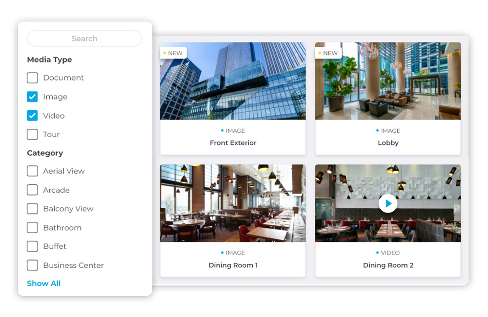 Bring every brand-approved asset together—images, videos, marketing copy, menus, and more. Organize your content by property, room type, restaurant, event space, or into custom collections. All in a branded, secure gallery that tracks access and usage.