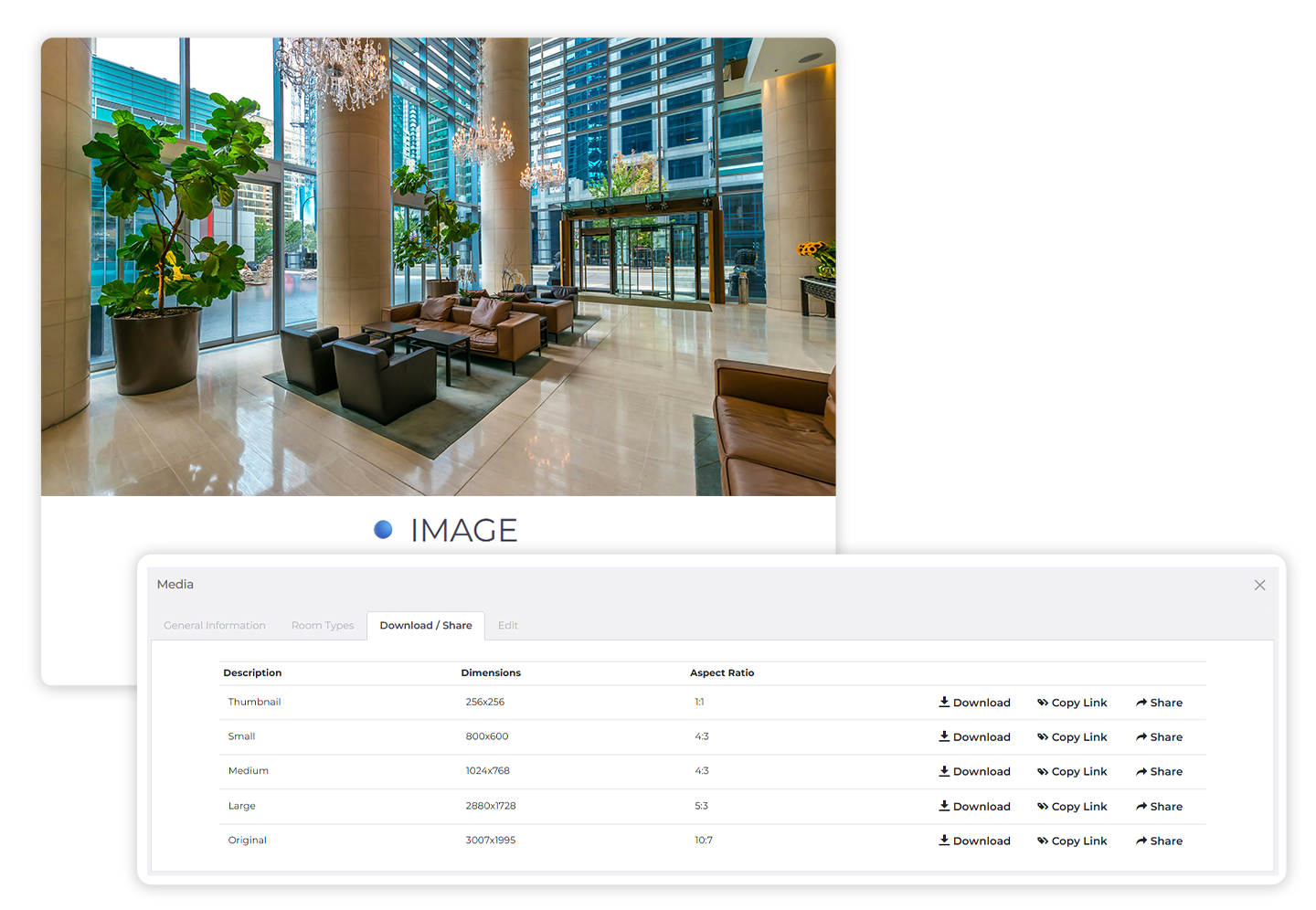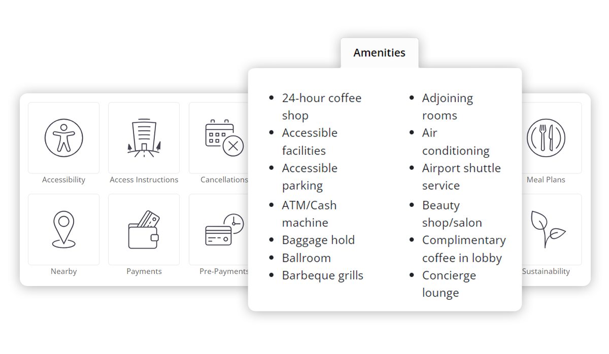 Go beyond the gallery. Store and share all of your hotel content: amenity lists, marketing text, sustainability practices, location details, policy information, and more. And it’s all sorted by properties, rooms, meeting rooms and dining.